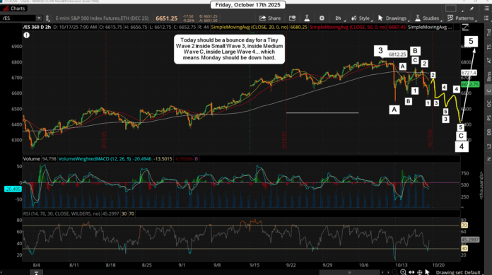 I only say that because today is OPEX and they might want the market to close around a certain zone to pin it for max profit of expiring options. The wave count is very bearish, and so are the technicals, which both support a bounce, but how long it holds is unknown. It might hold all day long and at the last hour rollover hard and keep going into next Monday. But I lean is that it holds all day to close the week out.