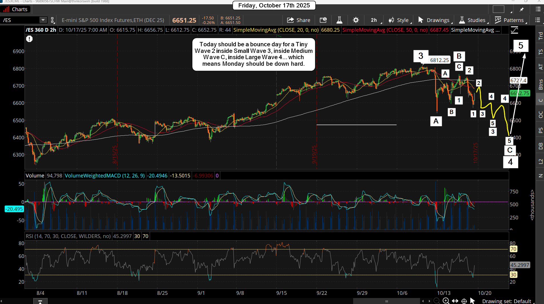 We rolled over yesterday to start what should be a wave 3 down inside a C wave. That wave 3 is probably going to subdivide into 5 smaller waves and with today being OPEX we could see the wave 2 bounce with yesterdays drop being the wave 1 down. If this happens we'll see the wave 3 of 3 of C down on Monday and into Tuesday where we could see the bottom of this move get hit, which I still think is around the 6400 zone.