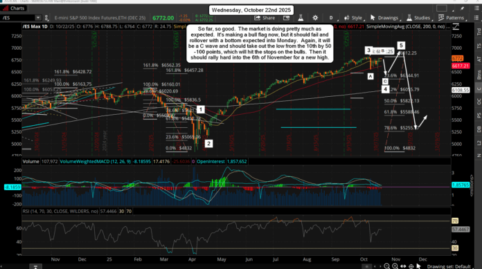 A flat day yesterday as expected. Today should start the pullback but if this is a C wave down I'd only look for the wave 1 to play out with the wave 2 back up happening to the close or early tomorrow. It's setting up for a wave 3 down inside a C wave to happen on Friday, and if it double bottoms the October 10th low the wave 4 bounce should happen in the Sunday futures with Monday the 27th having the wave 5 of C to hit the stops below the prior low and then reverse hard back up.