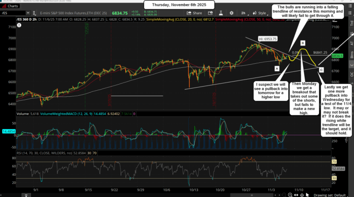 Maybe they keep it up all year, who knows for sure? But right now it's obvious that they won't allow any crash to happen, so I expect chop for about a week to work off some of the overbought conditions on higher time frames, and the only way to do that is to either chop to burn time or drop in price quickly to get it oversold. I'm thinking that we'll get down close to the 6700 zone on the ES at some point next week, and from that zone we'll start the next nice rally up into the first week of December where we should hit resistance and exhaust that 2 week rally.