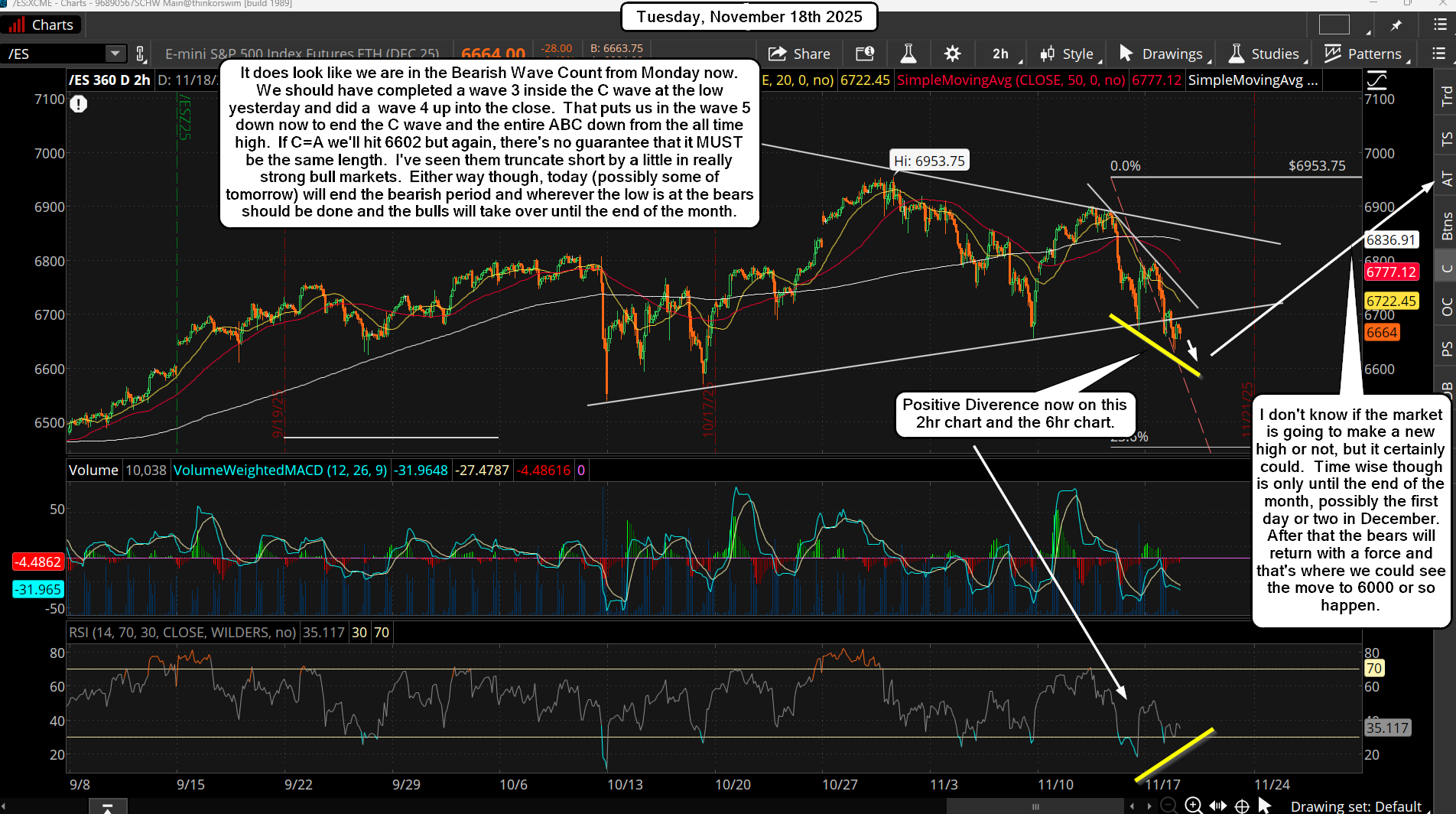 I said in yesterdays post that we could have a Bearish Wave Count play out where the C wave was equal to the A wave, and NOT a deep one to the 640.44 FP on the SPY like I would have loved to seen happen. This is looking more likely now that the C wave has either already ended at the 6658.50 low yesterday or will go a little low again today to reach the 6600 level. With the VIX up over 10% yesterday odds are very strong that we'll see a green day today or tomorrow at the latest.