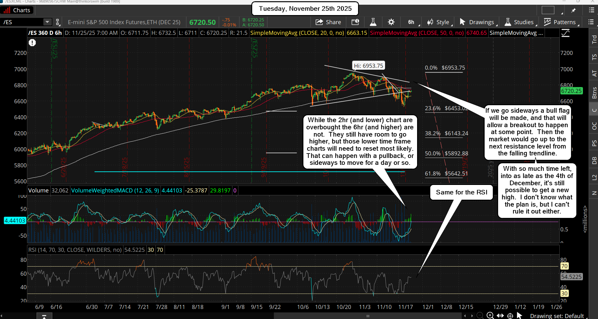 Short term charts are pretty overbought now (2 hour and below), so today could be a "pause" day where we might close slightly down or slightly up. But as long as it's not a big pullback it should be bought back up as the market is still in the bullish cycle period until as late as the 4th of next month. It doesn't have to go that far in time but I have to think that we should at least stay up into next week to work off some of the extreme bearish readings. Meaning it might not make a higher high, but should chop around whatever higher level it reaches for awhile before rolling over in the second week of December. Personally I think they will reach a new high to take out the stops on the bears that are shorting now, and those that have stops above the current all time high. But I don't see it reached this week... as it's likely going to drag into next week due to this week being shorten due to the Thanksgiving Holiday. Not more to add, so I'll keep this update short.