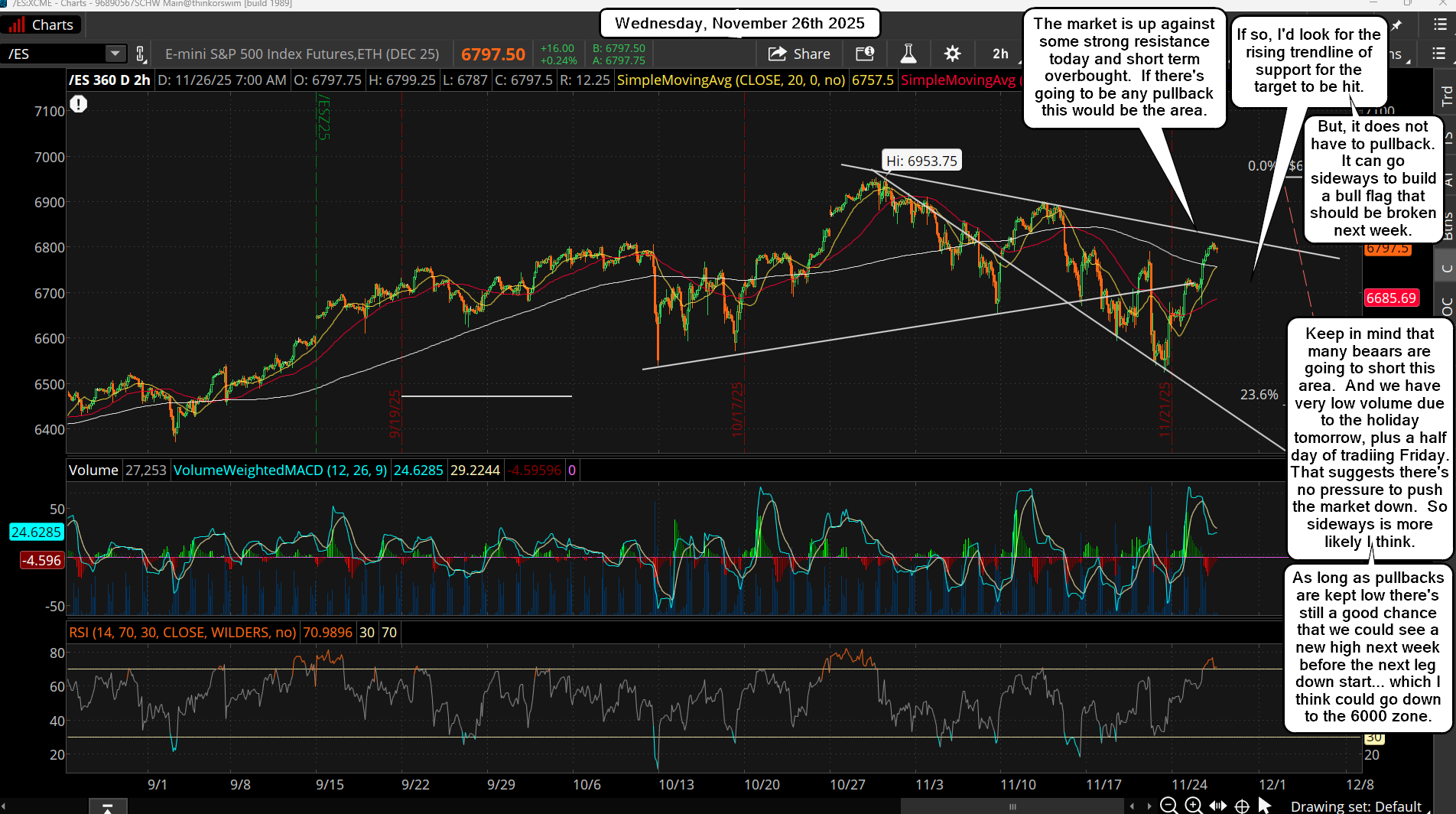 That will be the likely spot where bears short again I suspect. It's roughly 6820-6830 if hit today. If there's a pullback I think it will only be to backtest the 6780 zone from yesterdays high, as that's a triple top zone from 11/16 and 11/20, along with 11/25 of course. It should be support and from there we should continue higher into next week. Don't forget that Friday closes early at 1pm EST and of course we are close tomorrow.