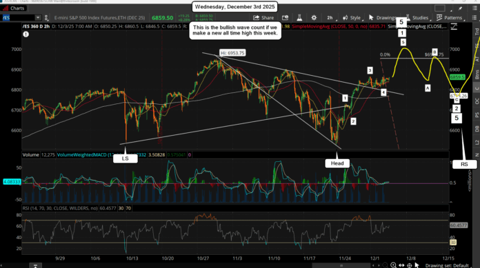 In fact, since I still see 7600+ into April/May of next year for the final high, we could be in a wave 1 inside a 5 wave move up for a final 5th wave to that 7600 target, and the wave 1 ends around 7000 this week. The sideways chop the past few days would be a smaller degree wave 4 with the move to 7000 being the smaller degree wave 5, which would then complete a medium degree wave 1 inside a larger degree wave 5 to 7600+.