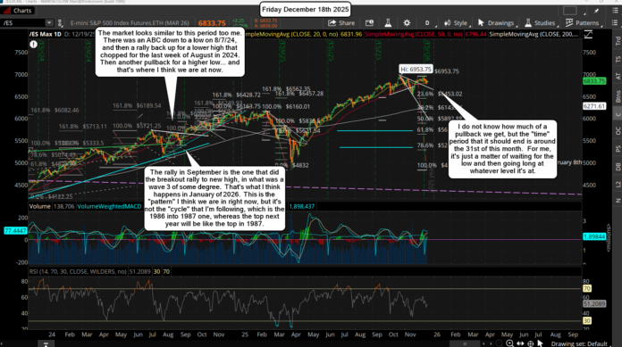 As we close out the week the market hasn't really done a whole lot of anything. It's had some good intraday moves down and back up but overall it's still trading in a big sideways range. I not expecting anything to change until we get into January, and between now and then we'll likely see more confusion as the market tries to trick and trap both bulls and bears alike.