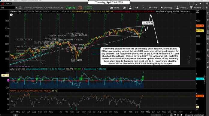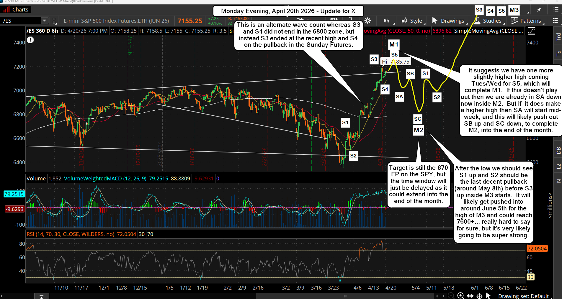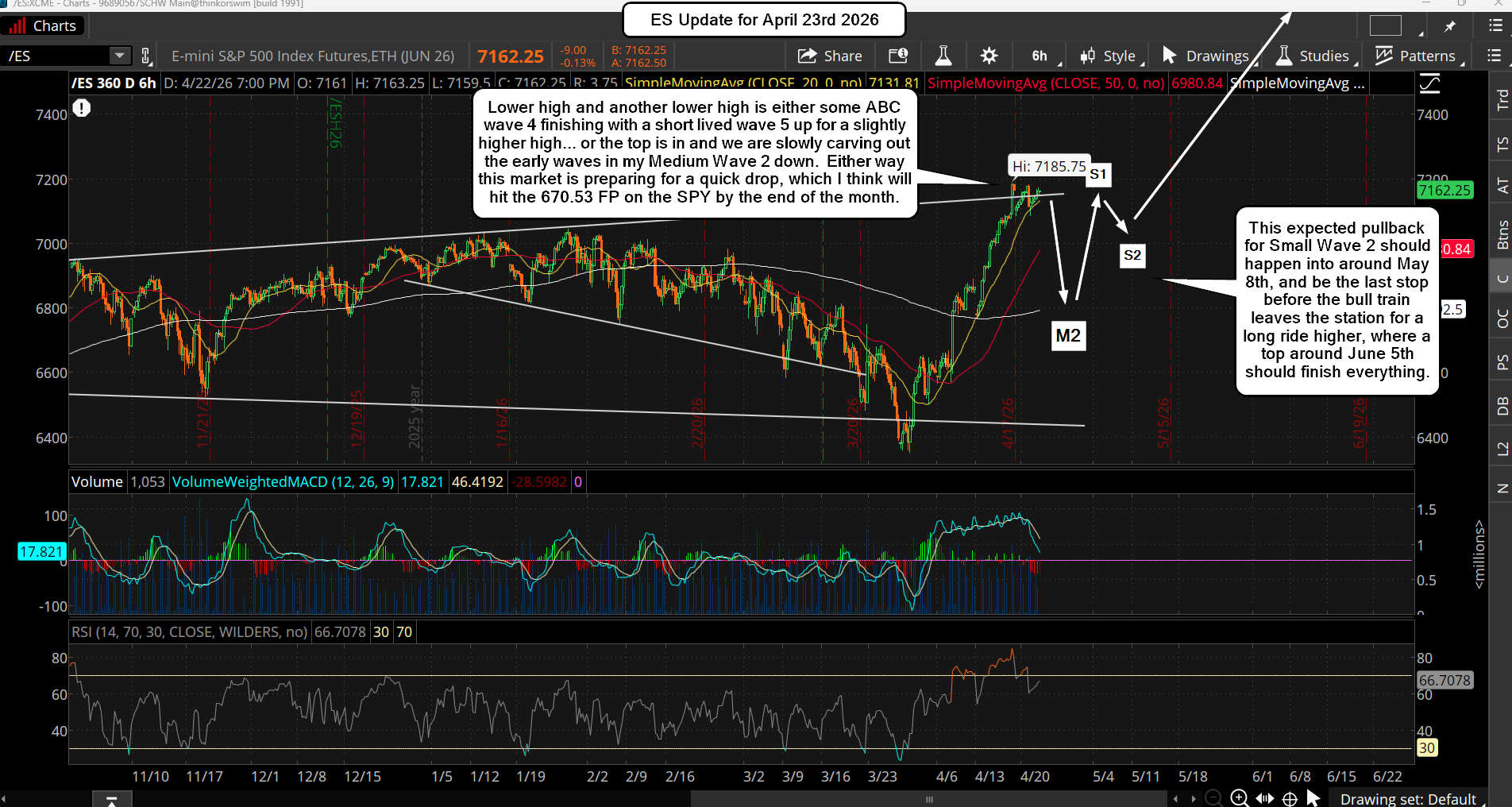 Nothing has changed as the market is topping out right now and still has a good pullback coming, which will likely happen over the weekend from the looks of it. The target is still the 670.53 FP on the SPY from 4/13, and of course it should pierce through it by some amount. I know that seems deep but in reality it's a normal percentage of a pullback, which will be around 50% or so. I posted a chart on X this Monday showing what I think is coming, and below is that chart.