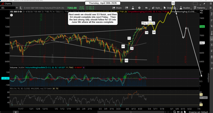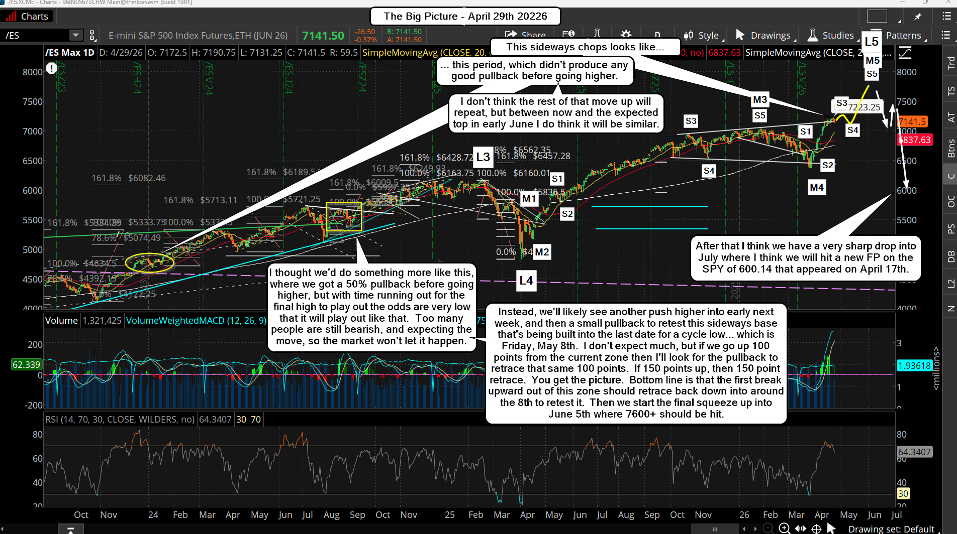 Then a pullback into the same range again into next Friday, May the 8th... which will be the last spot to get long before the non-stop grind upward happens into June 5th or so. It will be a slow but stead grind and will frustrate everyone on both sides. It will be designed to put everyone to sleep, and once we see 7600+ we'll see the bears finally give up and become bulls.